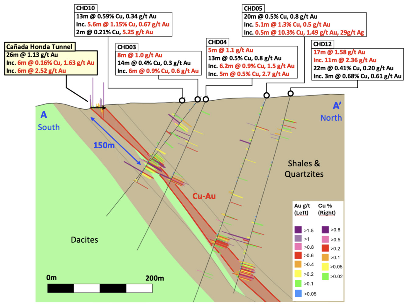 Figure 3 – Summary Geology Cross Section, Cañada Honda tunnel and selected drillhole results