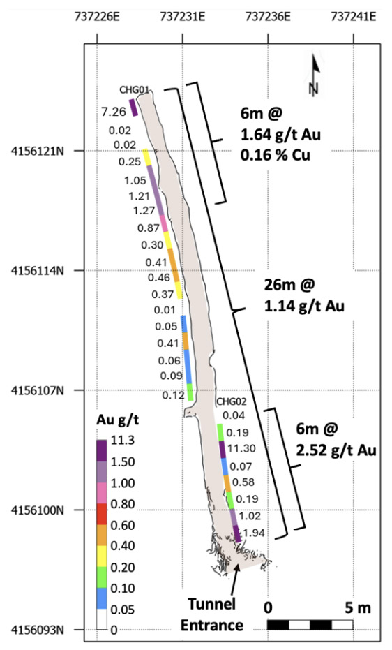 Figure 4 – Cañada Honda tunnel map with channel sample gold assay results