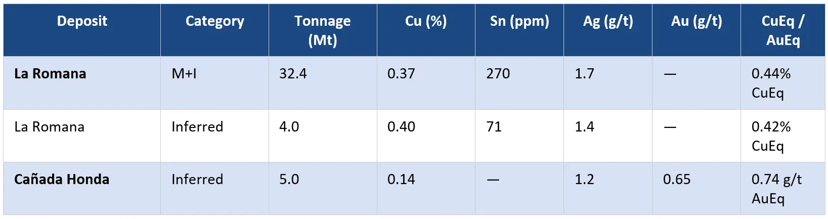 La Romana Inferred Resource: 4.0 Mt at 0.40% Cu, 71 ppm Sn, 1.4 g/t Ag, for 0.42% CuEq, containing 15,800 tonnes of copper, 300 tonnes of tin, and 0.2 Moz of silver. Applied cut-off: 0.2% Cu.