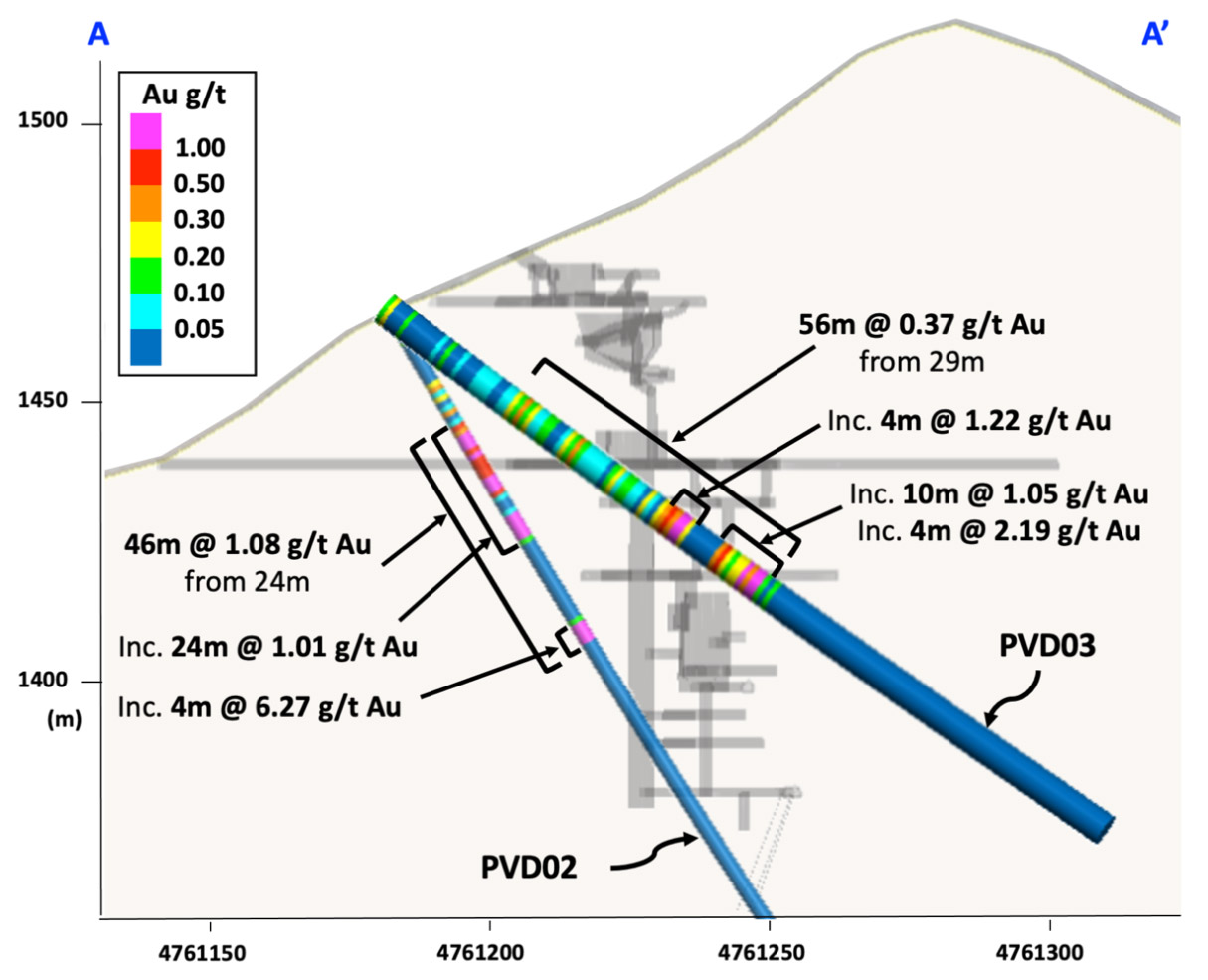 Figure 2 – Cross section A-A’ for drillhole PVD03 (drillhole PVD02 and historical mine workings projected on the section)